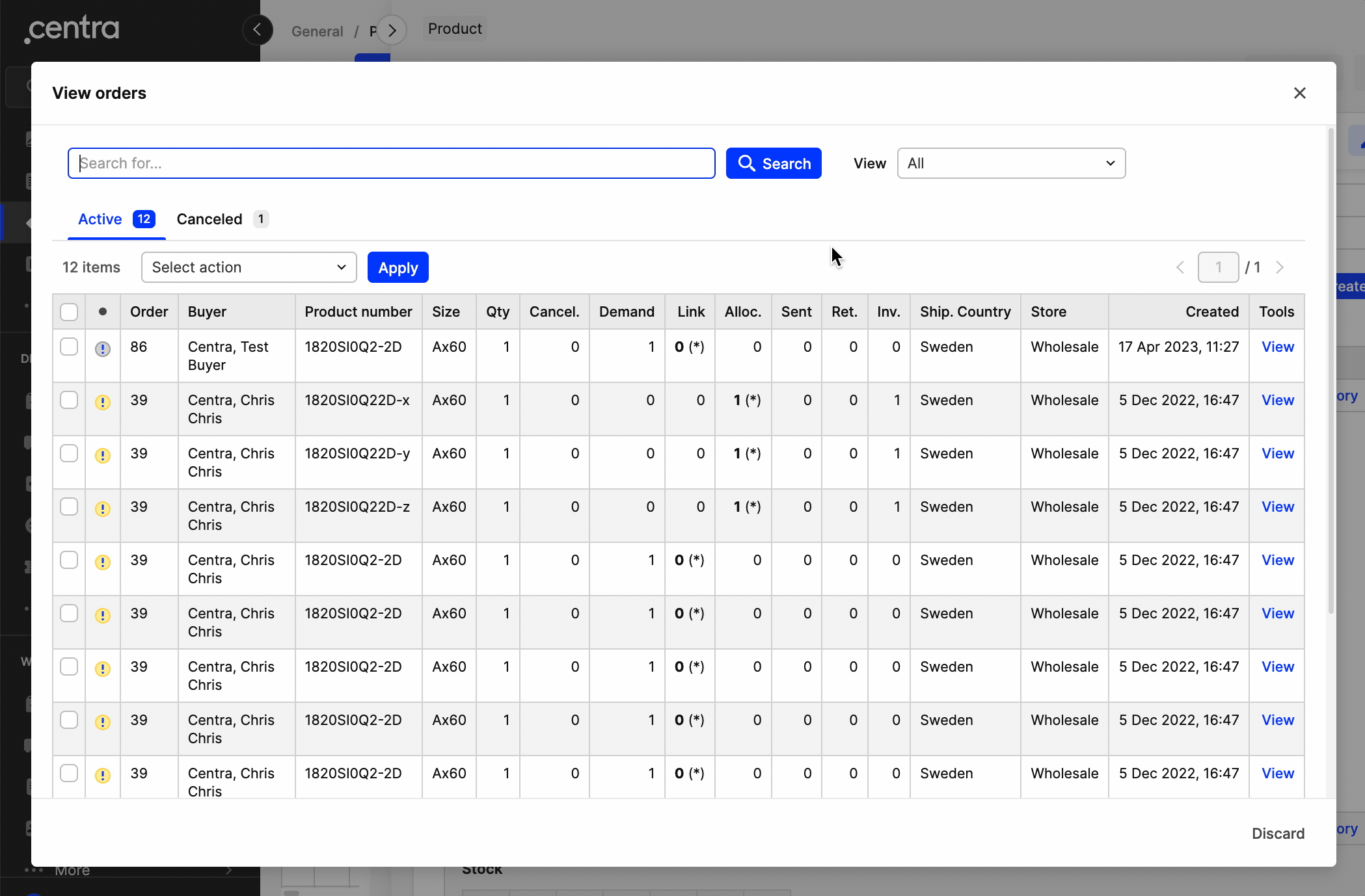 The main reason for using this pop-up is to review orders specific to the selected product. You can see how many orders have a particular order status and take appropriate action. You might want to see how many orders still have Allocated stock that has not been sent, take a note of those, and create/complete their respective shipments.