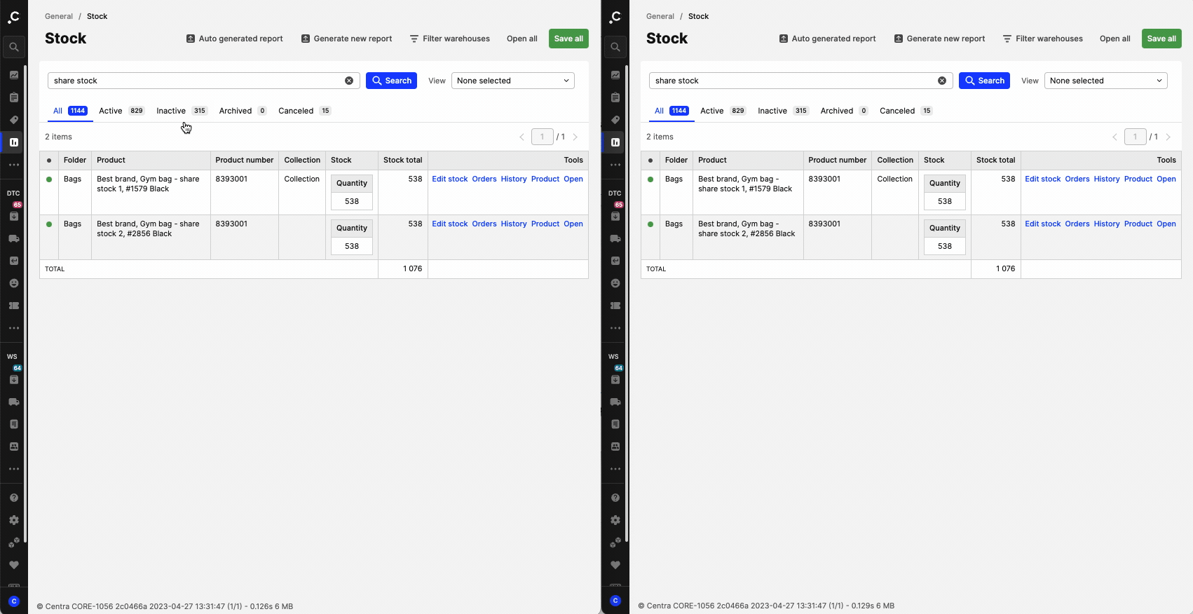 The shared stock feature allows you to have two or more products in Centra that share stock. When two or more products share stock, any changes made to the stock on one are automatically applied to the other. See the example below with two products that share stock, ‘Gym bag - share stock 1’ and ‘Gym bag - share stock 2’: