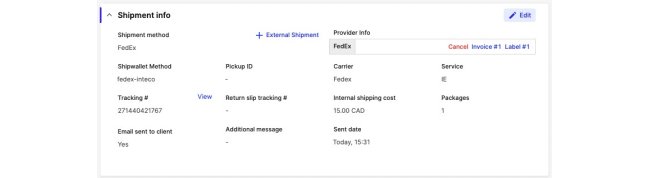 1. When you have a shipment, go down to the part where you're able to complete the shipment. You'll now see a field there called Shipment Method. Select the method you've created inside this field, a button called + External Shipment' will show up, press it. You will see the following view: