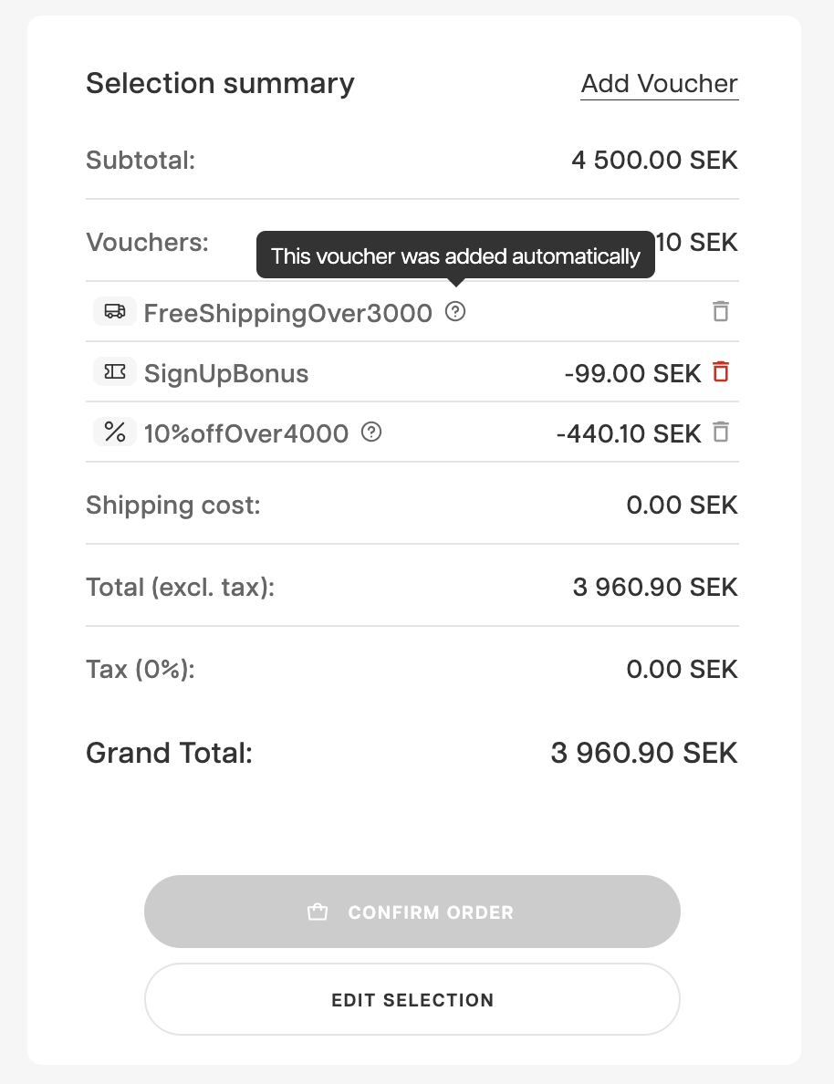 Namewill be displayed in the checkout summary, this includes auto-vouchers - make it short and sweet! - Auto-vouchers are clearly visible to the buyer, but not possible to remove
