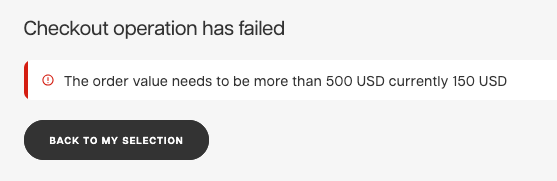 If the condition of when the minimum order amount is not fulfilled (e.g. ALL:10), the checkout will fail and it will show you this kind of message in the Showroom: