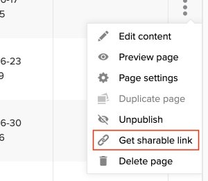 - To direct the users to the CMS Page, login to Showroom as an administrator, and navigate to Pages, find the page you would like to point to, click on the three dots in the last column and choose Get shareable link. Please make sure that the buyers you are going to send the campaign to, are in the market specified in the page settings