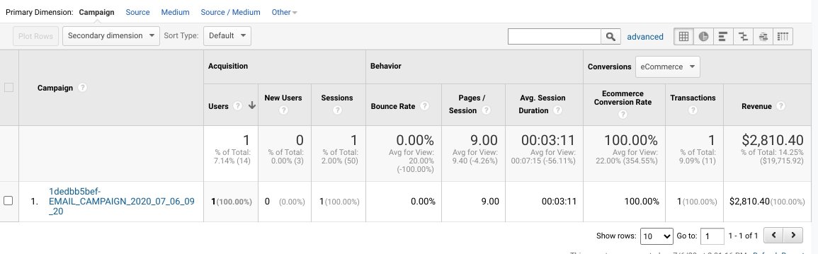 - After going into Google Analytics dashboard, Reports > Acquisition > Campaigns > All Campaigns, we can match the data with our recently sent campaign. We can also see total number of transactions and revenue generated by the campaign.