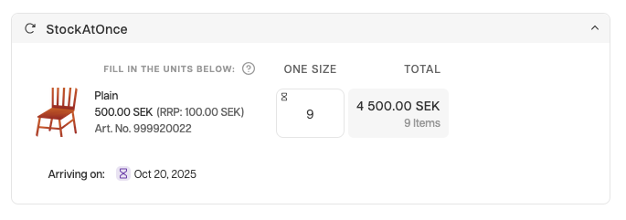 One of the ETA features in the Showroom is the hourglass badge. This is an indicator for products that have sizes out of stock, but have associated supplier orders/deliveries with ETAs. When hovering over the hourglass badge, you can see more information about sold-out items that are arriving at the warehouse soon. Additionally, the ETA can be seen by hovering over specific sizes. The hourglass badge is also displayed for products that are not completely sold out, but have unavailable sizes with corresponding ETAs.