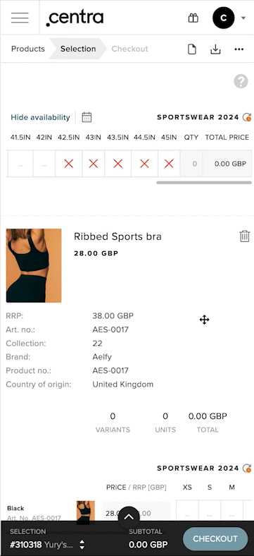 A 'Show/Hide availability' button is found on Mobile. This changes the visibility of ETA information in size charts. This state is applied globally, meaning that changing the visibility of the ETA affects all size charts. When 'Hide availability' is used, the cross showing sold-out products is gray, whereas with 'Show availability' the color ETA highlights appear: