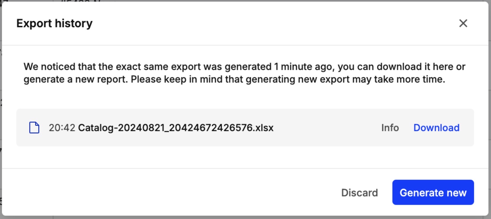 - If a user attempts to export a catalog using the same settings as a file generated in the past 24 hours, a pop-up will prompt them to download the already generated file